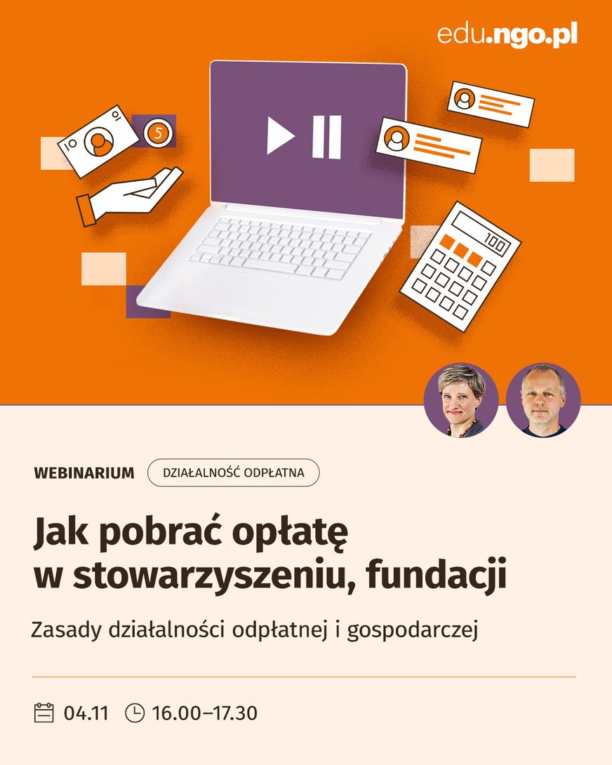 Zapraszamy ⏰ 4 listopada 2025 r. o godz. 16:00 na webinarium o zasadach prowadzenia działalności odpłatnej i gospodarczej w organizacji pozarządowej.
